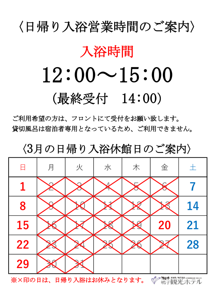 2026年3月の日帰り入浴の営業のお知らせになります。